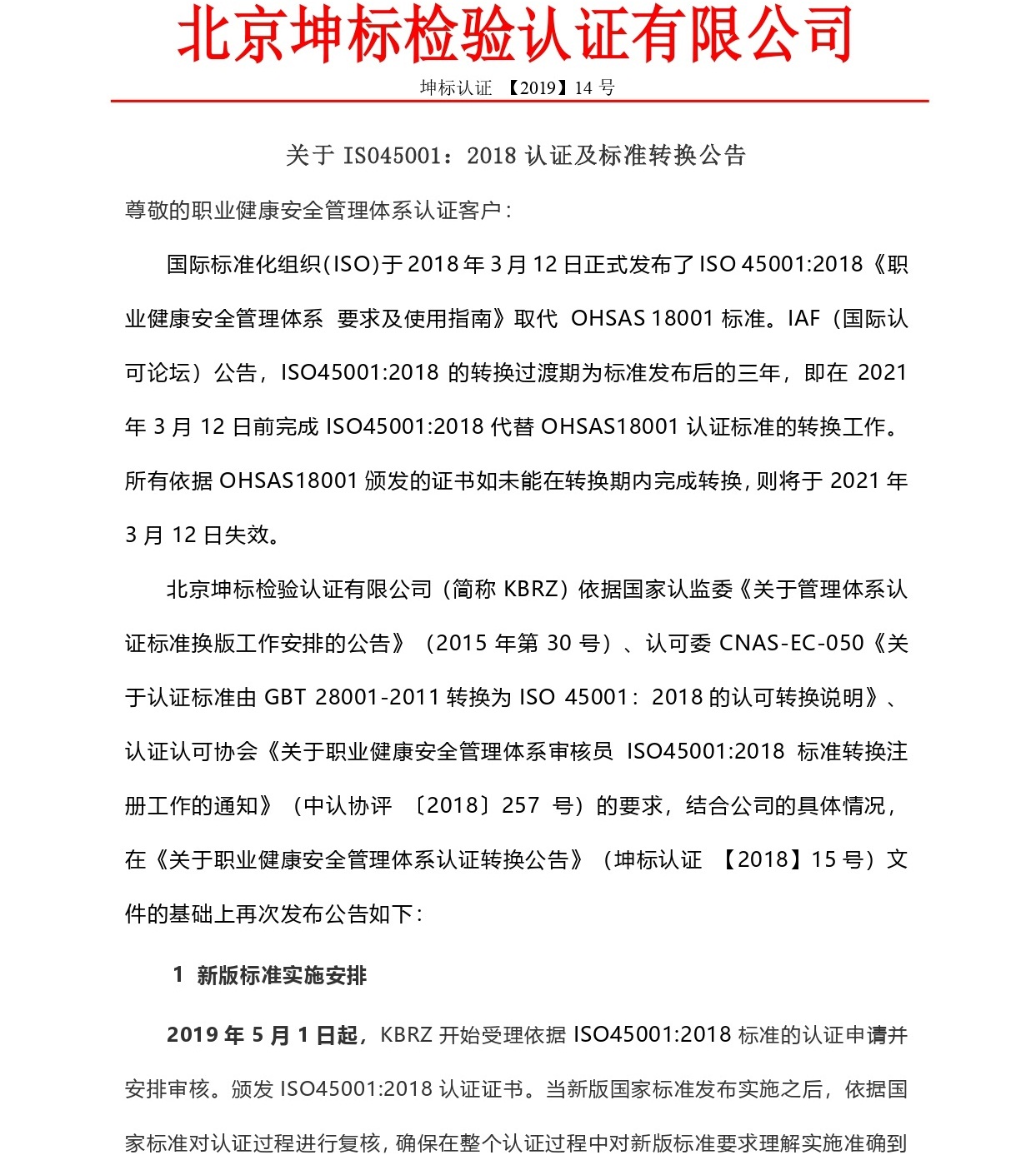 關(guān)于職業(yè)健康安全管理體系認證轉(zhuǎn)換公告